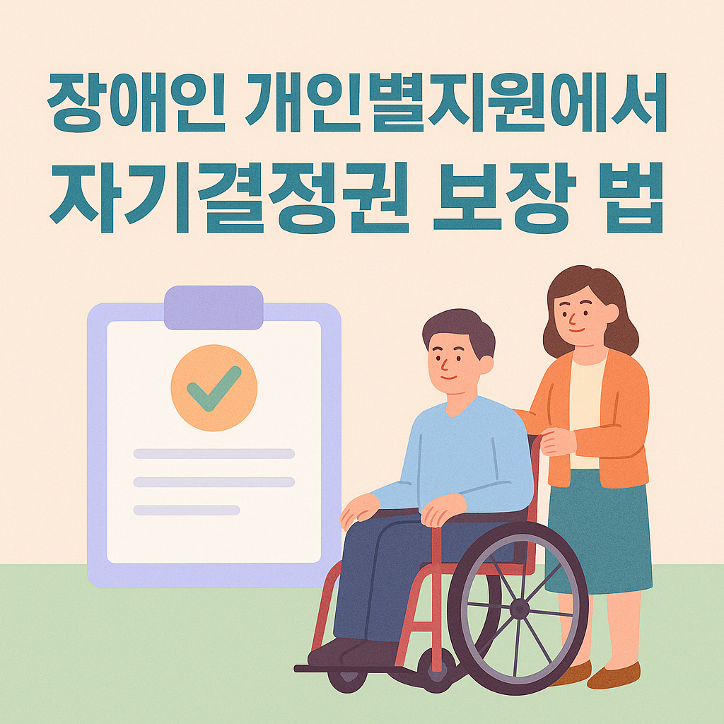– 진정한 개인별지원은 ‘스스로 선택하는 것’에서 시작된다 –1. 들어가며장애인 개인별지원의 핵심 철학은 ‘당사자 중심’이며, 그 중심에는 반드시 **자기결정권(Self-determination)**이 존재합니다.자기결정권은 장애인이 자신의 삶에 대해 직접 선택하고 결정할 수 있는 권리로, 유엔장애인권리협약(CRPD)에서도 강조하는 매우 중요한 가치입니다.그러나 실제 현장에서는 자기결정권이 충분히 보장되지 않거나, 형식적으로만 반영되는 문제가 자주 발생합니다.이 글에서는 장애인 개인별지원에서 자기결정권을 구체적으로 보장하는 방법을 단계별·실천 중심으로 정리합니다.2. 자기결정권이 왜 중요한가?1. 개인 삶의 주인이 되는 과정자기결정권이 보장될 때 장애인은 단순히 지원을 ‘받는 사람’이 아니라자신의 삶을 ..
