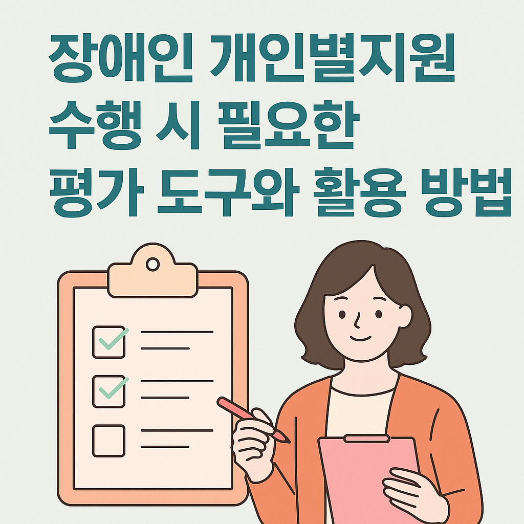 ""– 정확한 평가가 개인별지원의 출발점이자 성공의 핵심이다 –1. 들어가며장애인 개인별지원의 핵심은 “개인의 욕구와 목표에 맞는 맞춤형 지원을 설계하는 것”입니다.그런데 그 맞춤형 설계를 위해 반드시 선행되어야 하는 단계가 바로 **정확한 평가(Assessment)**입니다.평가 도구는 단순히 점수를 매기기 위한 것이 아니라,✔ 당사자의 현재 기능 수준 파악✔ 강점과 욕구 발견✔ 서비스 우선순위 설정✔ 개인별지원 계획 수립을 위한 필수적인 과정입니다.이 글에서는 장애인 개인별지원 수행 시 실제 현장에서 가장 많이 사용하는 평가 도구와그 활용 방법을 구체적으로 정리했습니다.2. 장애인 개인별지원에서 평가가 중요한 이유 지원의 정확도 향상평가가 부정확하면 개인별지원 계획도 왜곡되고,불필요한 서비스가 제공되..